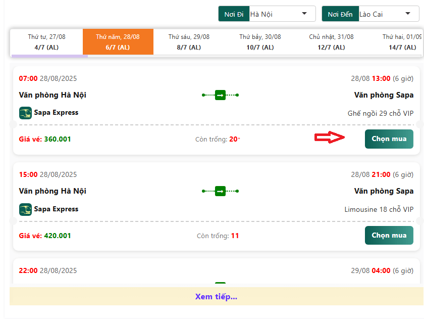 Bước 1: Đặt vé xe khách Sapa Express đi Lào Cai tại: https://vexekhachvn.com/xe-sapa-express/ chọn chuyến đi có thời gian khởi hành và điểm đón/trả phù hợp click “chọn mua”.