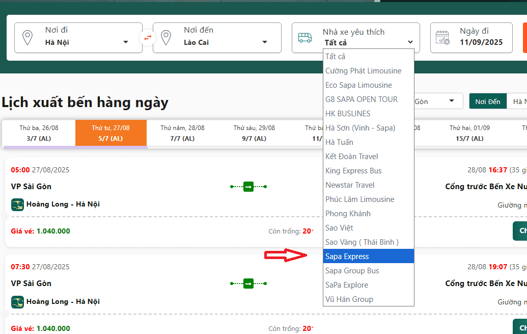 Đặt xe khách liên tỉnh đi Lào Cai tại: vexekhachvn.com và chọn: Nơi đi (Hà Nội) → nơi đến (Lào Cai) → lọc nhà xe Sapa Express theo hướng dẫn từ ảnh bên dưới.