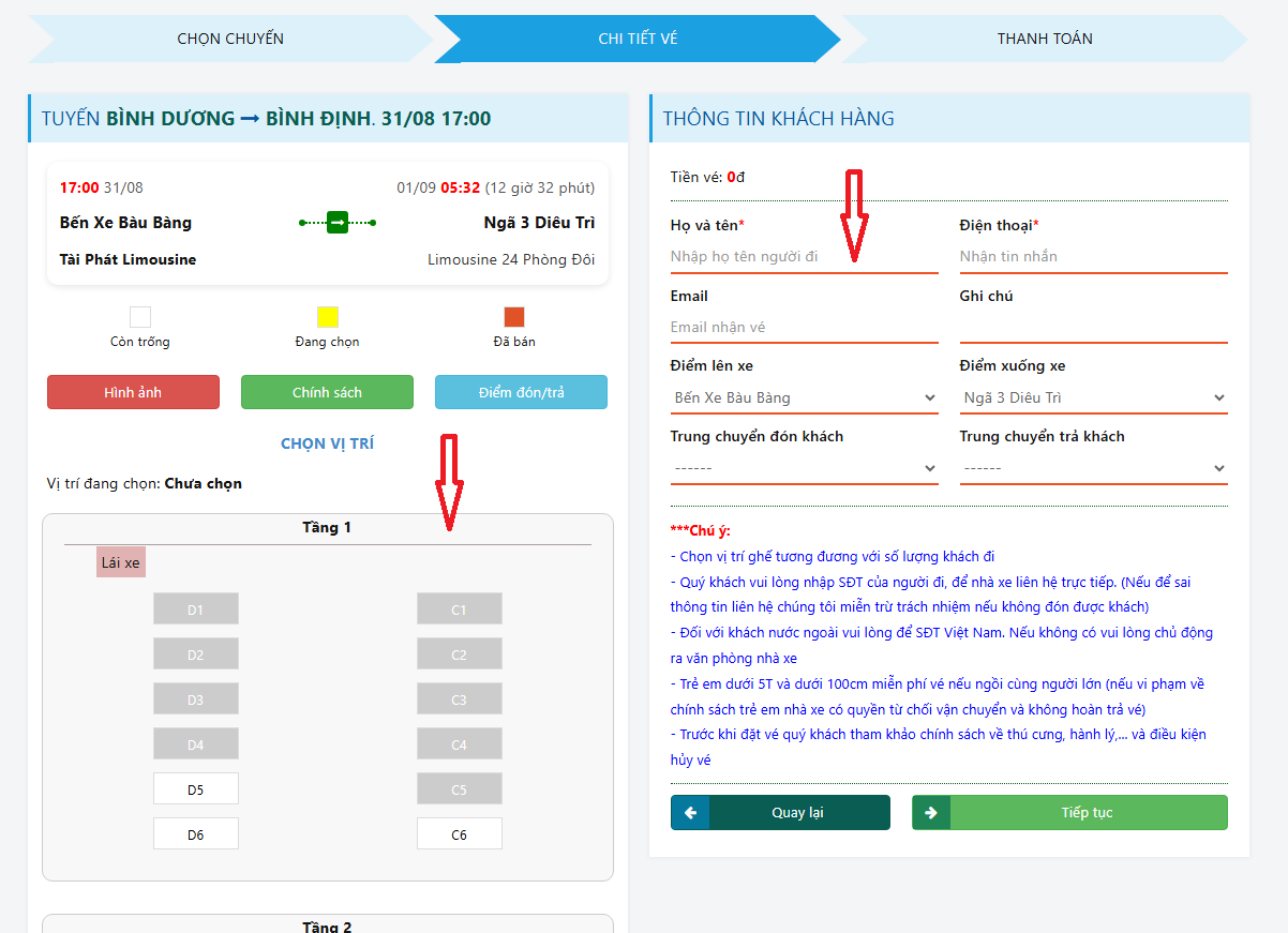 Hệ thống sẽ hiển thị sơ đồ ghế. Hãy chọn vị trí còn trống mà bạn mong muốn, sau đó điền đầy đủ thông tin hành khách, bao gồm họ tên, số điện thoại, email, điểm đón, điểm trả và điểm trung chuyển (nếu có).