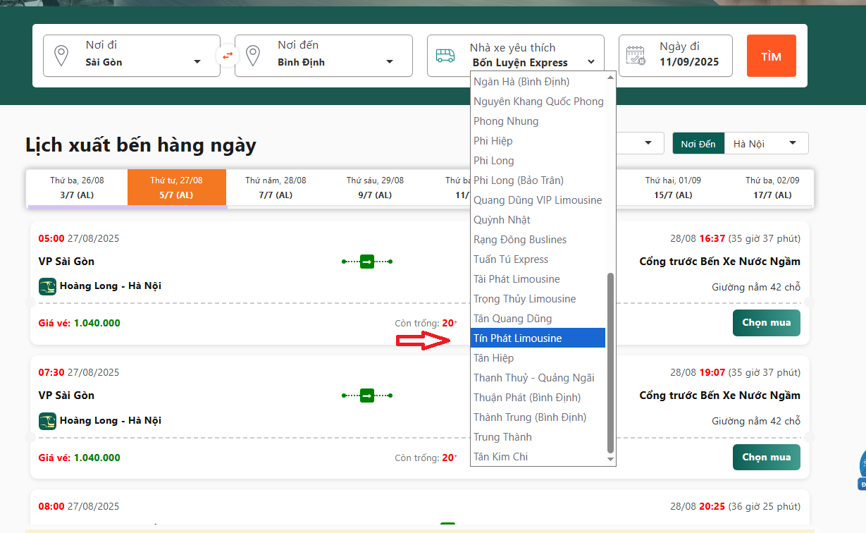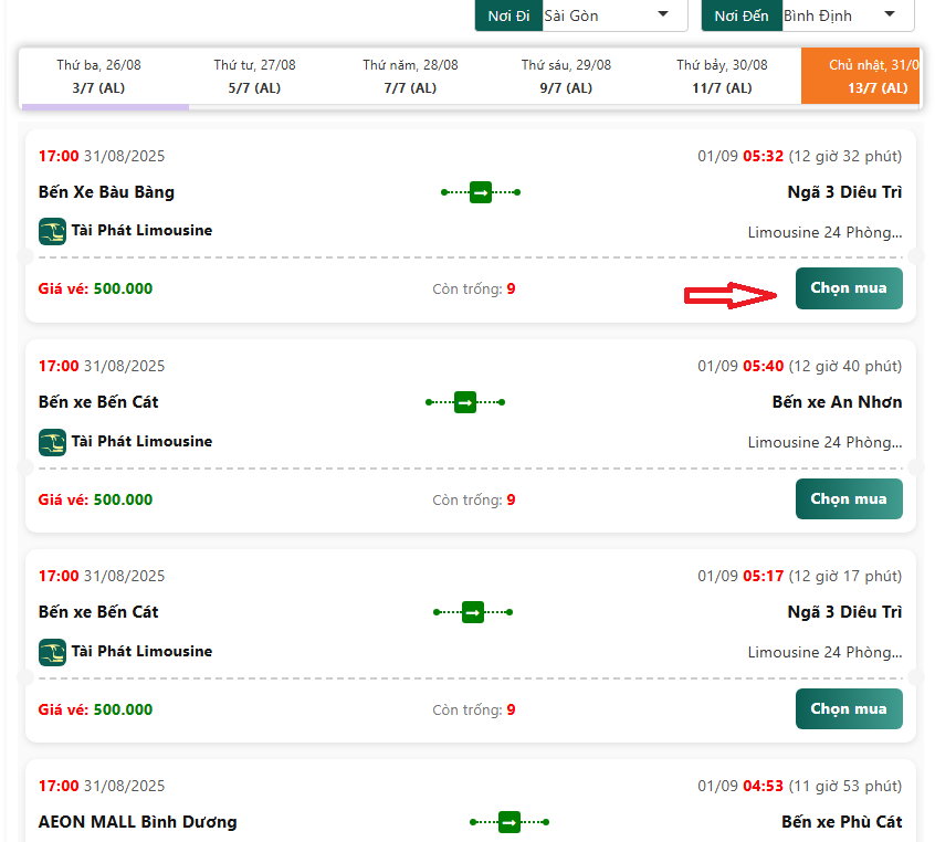 Xem giờ khởi hành và các điểm đón/trả, sau đó nhấn “Chọn mua” để tiếp tục quá trình đặt vé.