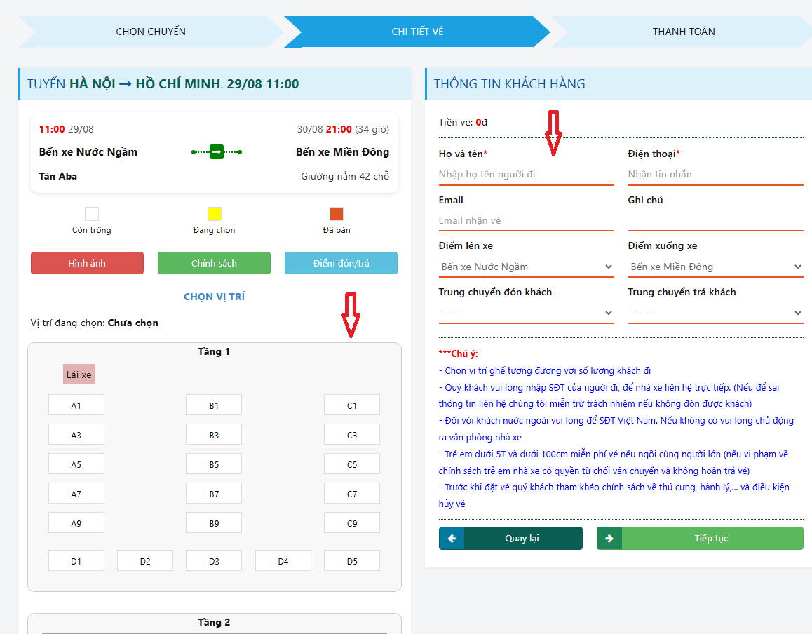 Bước 3: Chọn ghế - điền thông tin - chọn điểm đón trung chuyển - điểm đến