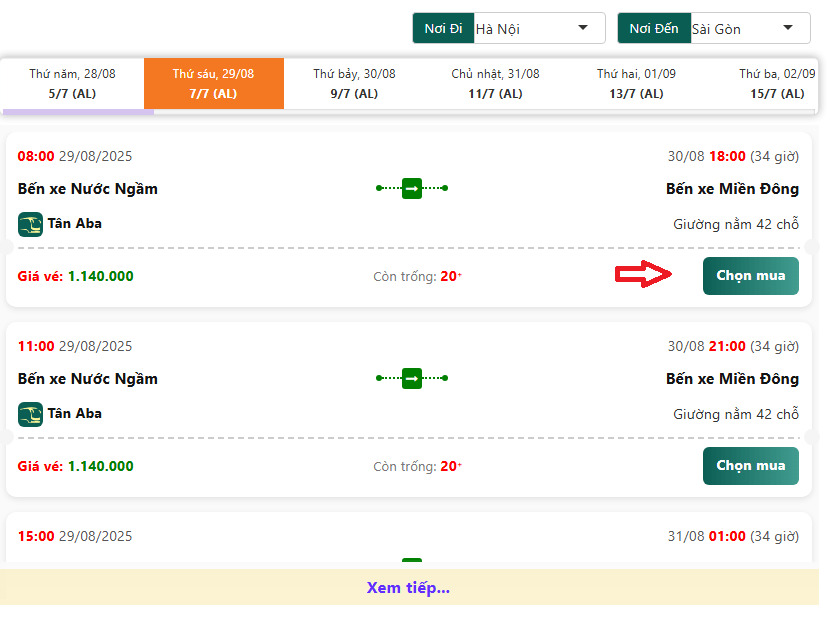 Bước 1: Đặt vé xe khách Tân Aba đi Sài Gòn tại: https://vexekhachvn.com/xe-tan-aba/ chọn chuyến đi và nhấn “chọn mua”.