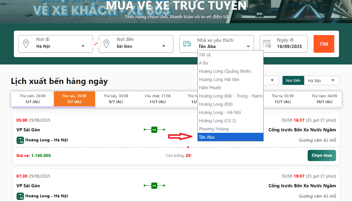 Đặt xe khách liên tỉnh đi tại: vexekhachvn.com và chọn: Nơi đi (Hà Nội) → nơi đến (Sài Gòn) → lọc nhà xe Tân Aba theo hướng dẫn từ ảnh bên dưới.
