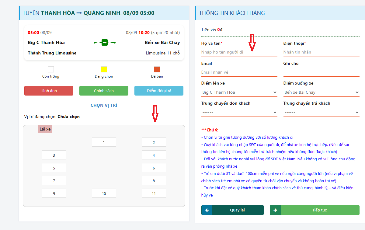 Bước 3: Chọn ghế - điền thông tin - chọn điểm đón trung chuyển - điểm đến