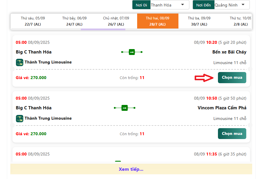 Bước 1: Đặt vé xe khách Thành Trung Limousine đi tại: https://vexekhachvn.com/xe-thanh-trung-limousine/ chọn chuyến đi và nhấn “chọn mua”.