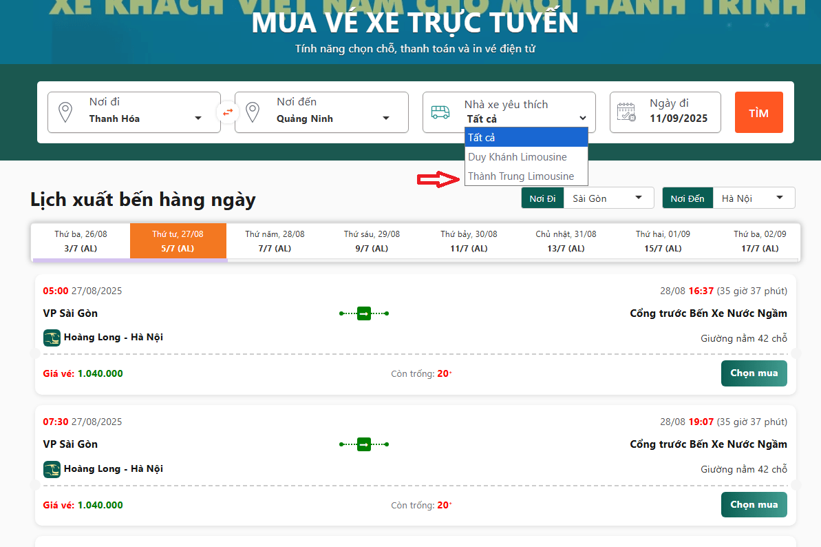 Đặt xe khách liên tỉnh đi tại: vexekhachvn.com và chọn: Nơi đi (Thanh Hoá) → nơi đến (Quảng Ninh) → lọc nhà xe Thành Trung Limousine theo hướng dẫn từ ảnh bên dưới.