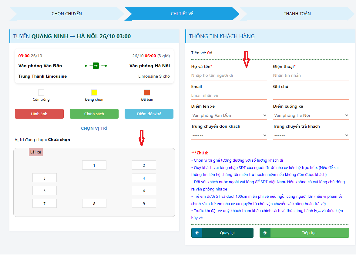Bước 3: Chọn ghế - điền thông tin - chọn điểm đón trung chuyển - điểm đến