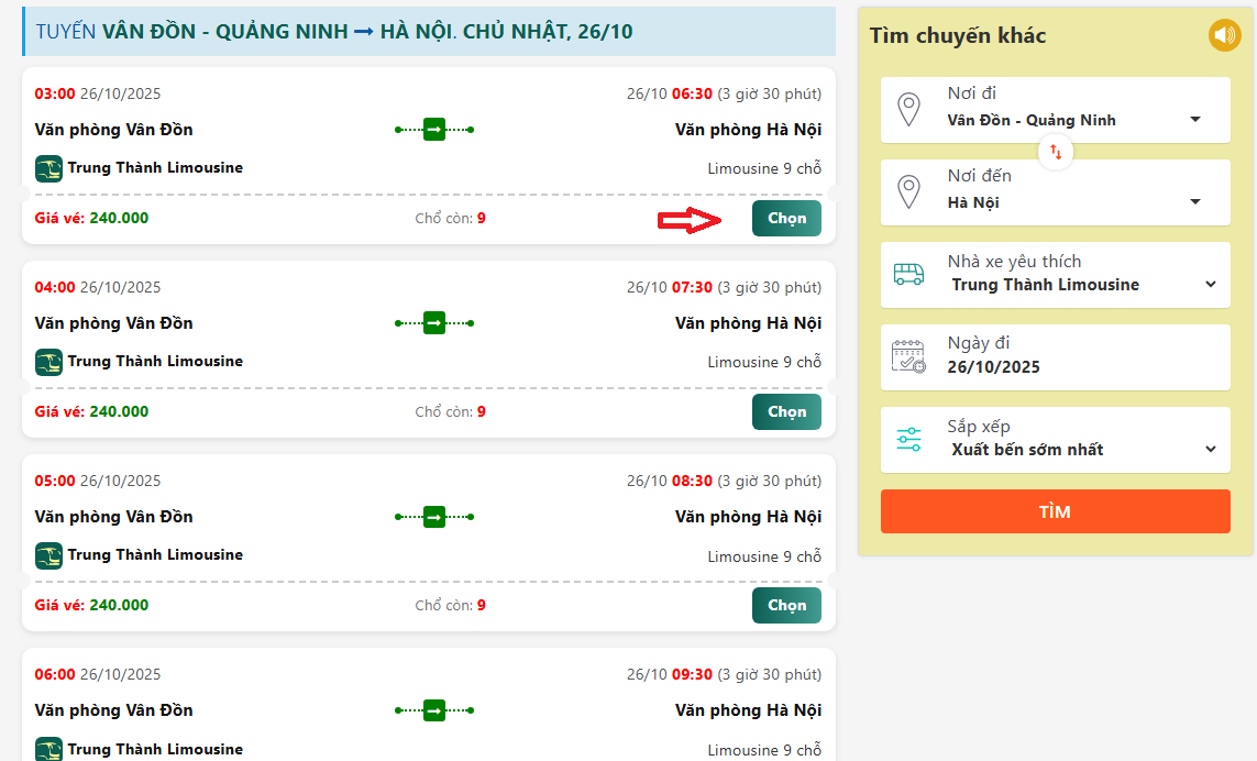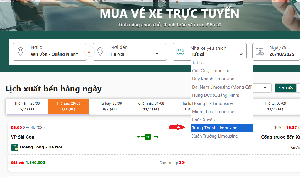 Chọn điểm đi (Vân Đồn - Quảng Ninh) và điểm đến (Hà Nội), rồi chọn nhà xe Trung Thành Limousine.